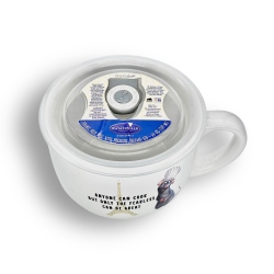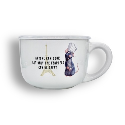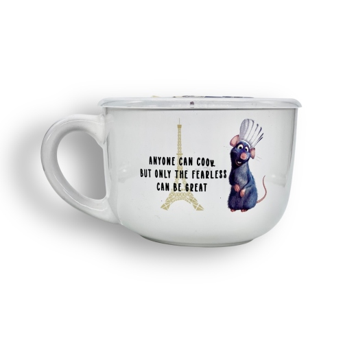 Taza blanca de Ratatouille con tapa, perfecta para inspirar tus mañanas. Remy asoma en el centro rodeado por la icónica frase: "Anyone can cook, but only the fearless can be great", acompañada de la Torre Eiffel. Un diseño encantador que combina ternura y valentía.