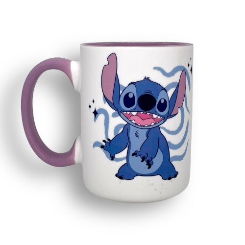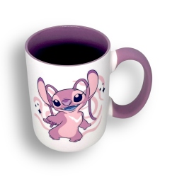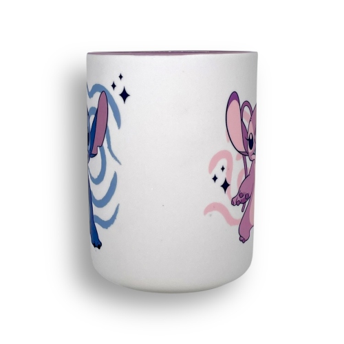Taza blanca de cerámica mate con asa e interior rosado, decorada con un tierno diseño de Stitch y Angela. Ideal para acompañar tus bebidas con un toque romántico y encantador de Lilo & Stitch.