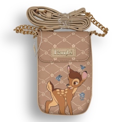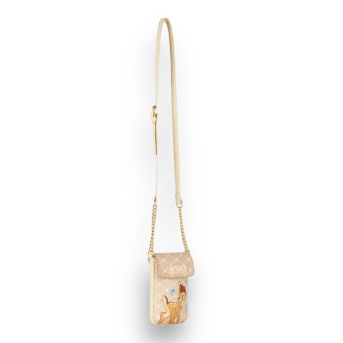 Luce tu amor por Bambi con este elegante porta celular color crema. Con diseño estampado del personaje, cadena dorada tipo crossbody y cierre de cremallera, es perfecto para llevar lo esencial con estilo. Material: poliuretano recubierto. Ideal para salidas ligeras con un toque Disney.