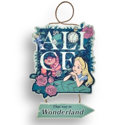 Decora tu espacio con un toque mágico con este cartel para puerta de Alicia en el País de las Maravillas. Presenta a Alicia y el Gato Cheshire con la frase colgante “Wonderland this way”. Ideal para habitaciones, estudios o rincones de fans del clásico de Disney.