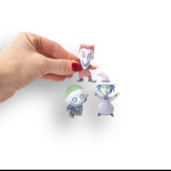 Figuras aterciopeladas con una textura suave y espeluznante, estilo fan y un ambiente de exhibición.